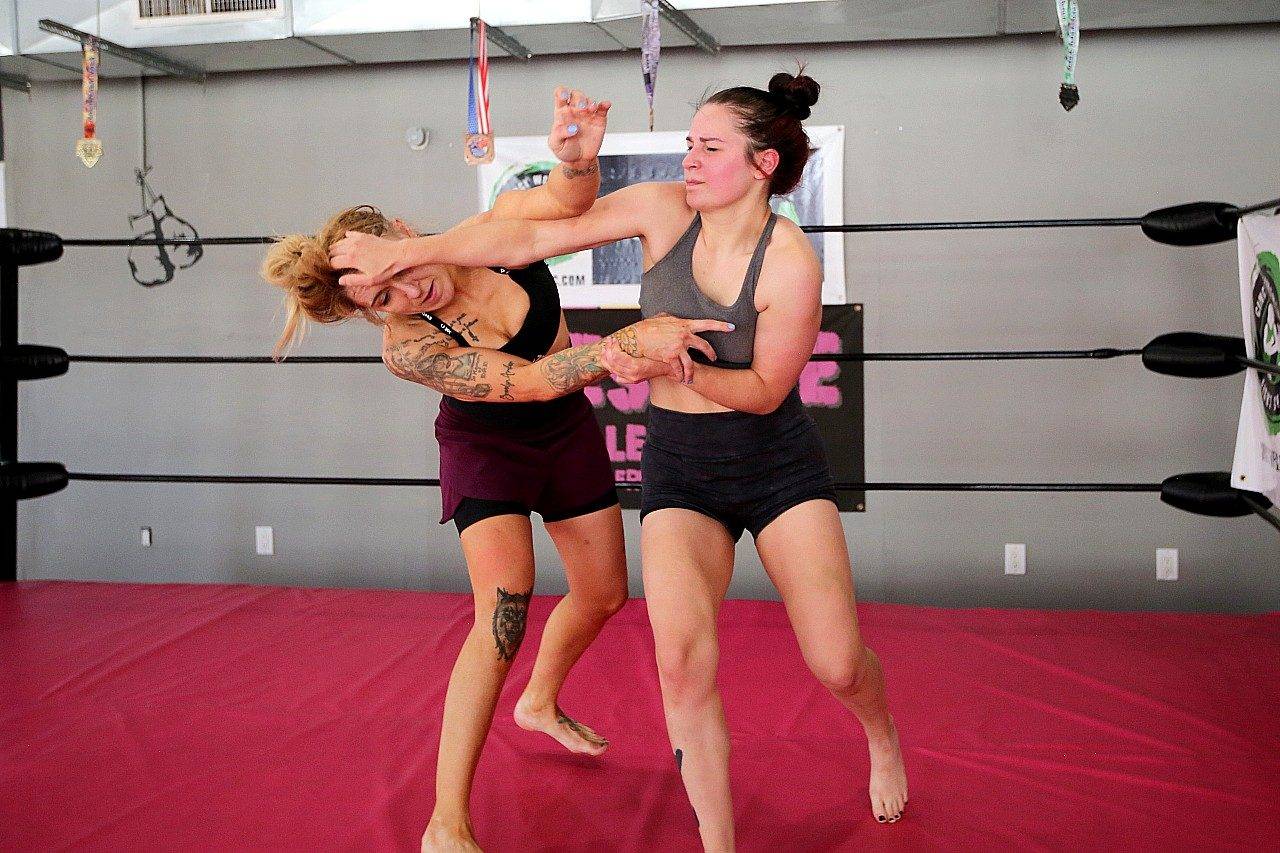 Indy Pro Wrestler Nicole Pain comes to the IWFA to take on Styna (FFV454) and Liza. Nicole is known for her rough, aggressive, physical style of pro wrestling. She usually trains and fights with men. She is 5’3, 130 lbs of muscle, speed and BJJ. She and Liza are evenly matched in size, strength and skill. The first submission takes over 17 minutes to achieve. Stalking includes slaps and hairpulling as the match progresses. The groundfighting is rough and intense, as the two work to avoid the other’s upper body strength and knowledge of submissions. The match ends on a submission that takes 9 minutes to achieve. The aftermath leaves the two exhausted and wanting more of each other. A definite rematch to come, as Nicole loves the IWFA style and wants to return over and over. A great follow up to FFV454 and a match the fans will love! Nicole is such a great fit with us!